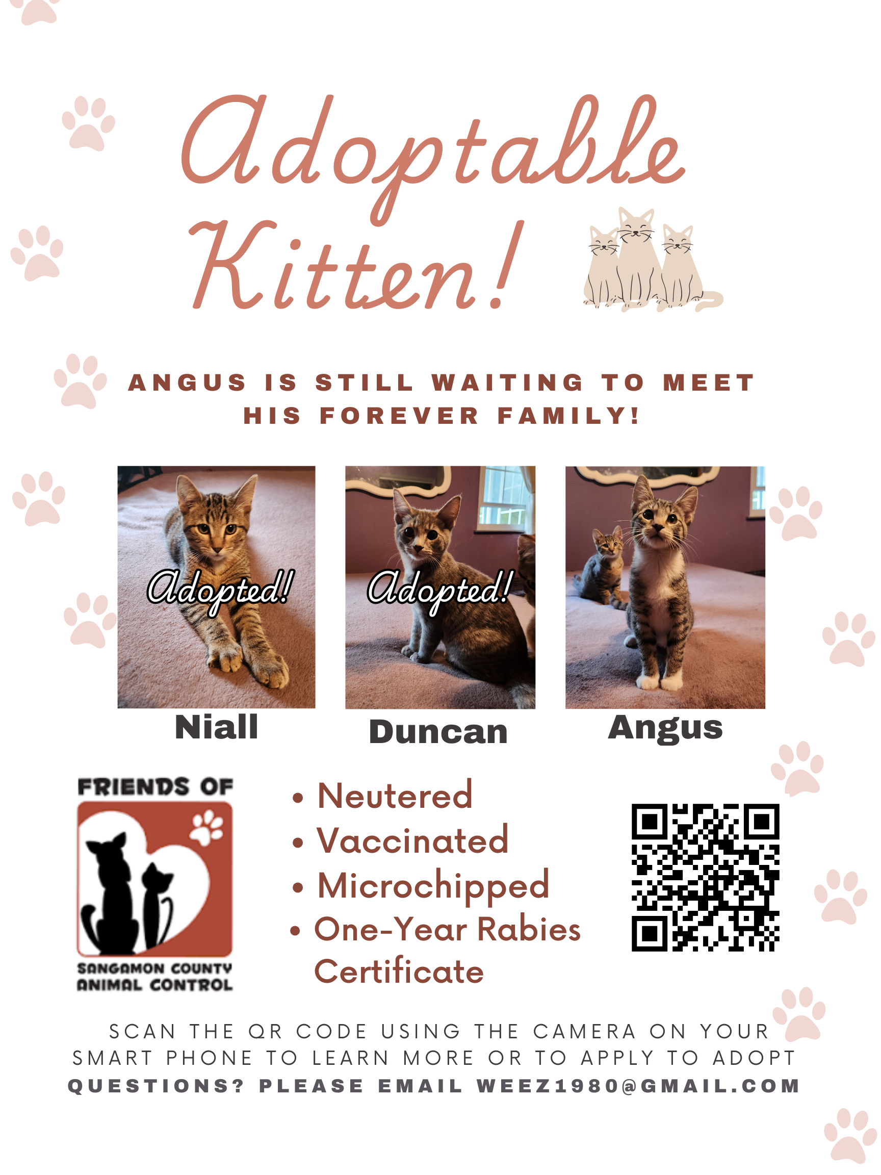 Duncan and Niall have been adopted into loving homes, but Angus hopes to meet his forever family soon too! Angus is approximately five months old. He and his litter mates kittens have been living in a home for several months and as such they are highly socialized and very friendly with the humans and other cats they share a home with. Angus is litter box trained and has been neutered, vaccinated, and microchipped! Please take a look at the photos and information about Angus below. Please email weez1980@gmail.com with any questions. If you are interested, please fill out a Friends of SCAC Adoption Application.