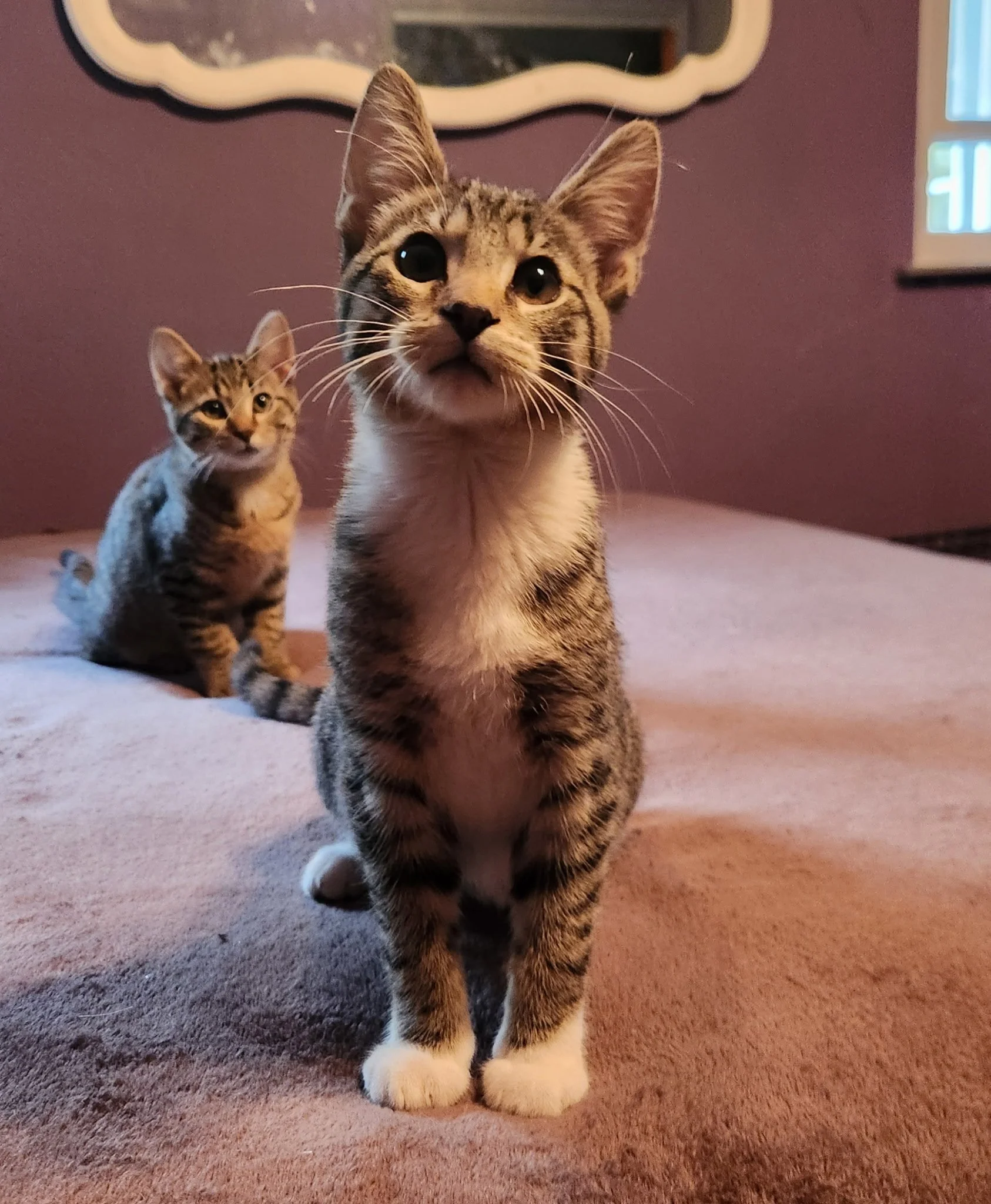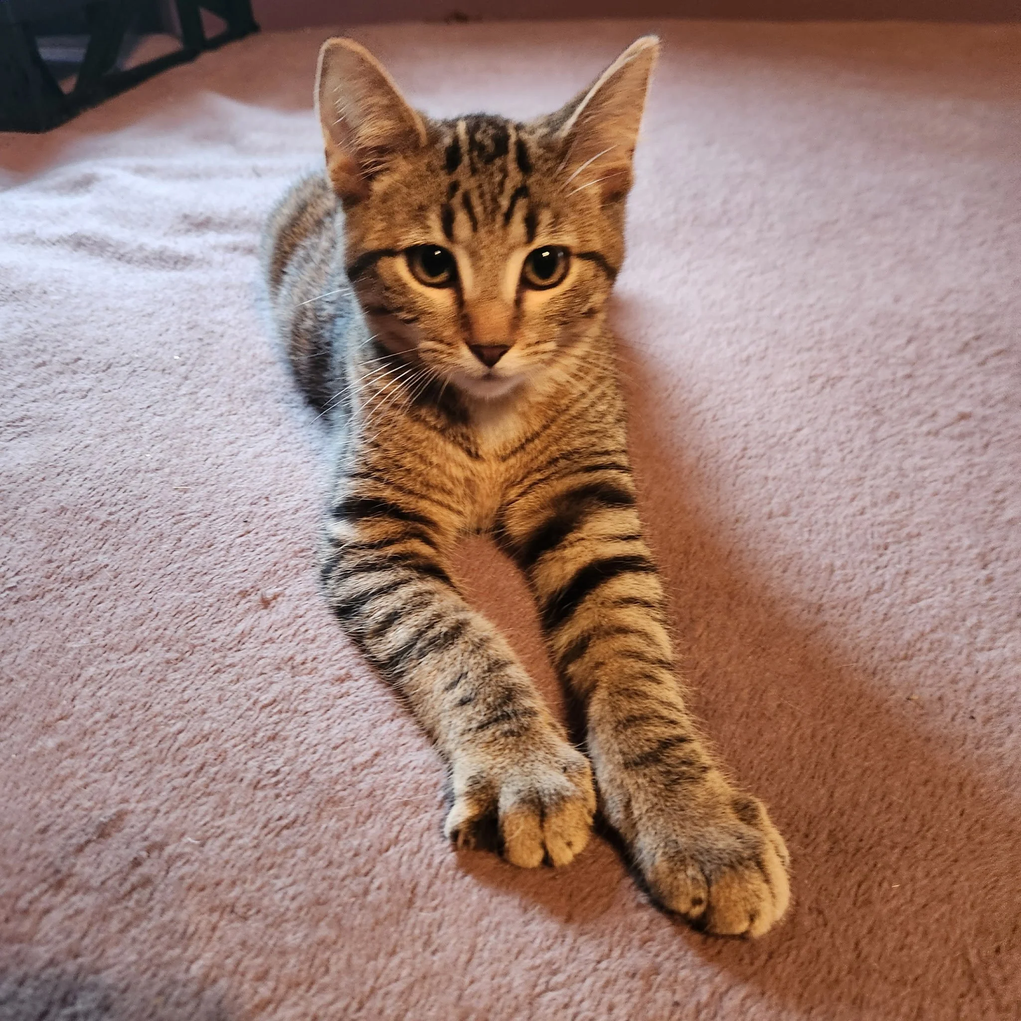 Niall is the smallest kitten from this litter. He is a beautiful tabby with a white spot on his chest. He loves spending time in his pet bed relaxing. He has the softest little purr and meow. Although he is small, Niall is an independent and confident little cat!