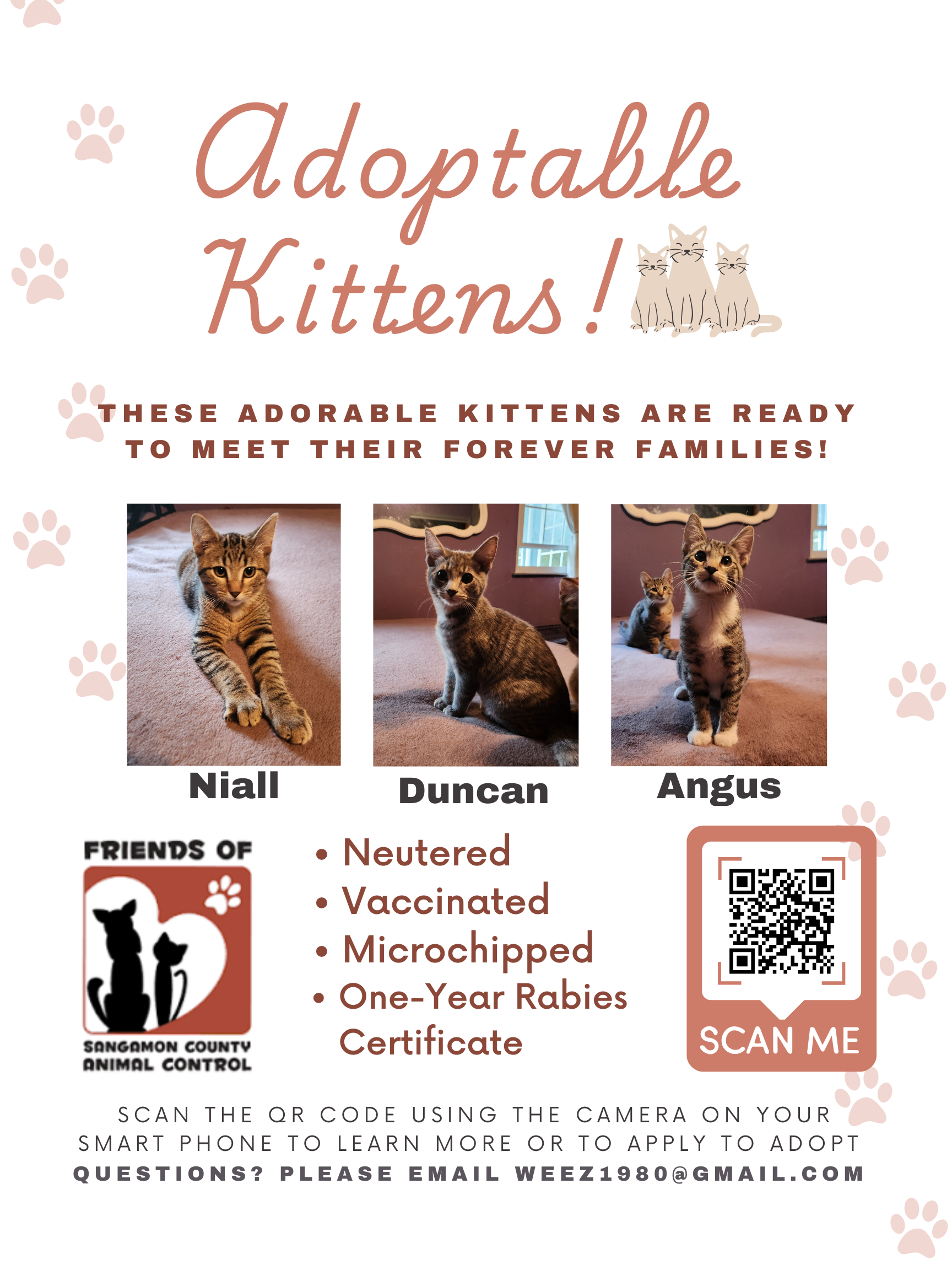 Niall, Duncan, and Angus hope to meet their forever families soon! All three kittens are approximately four months old and from the same litter. The kittens have been living in a home for several months and as such they are highly socialized and very friendly with the humans and other cats they share a home with. All three are litter box trained. Niall, Duncan, and Angus have been neutered, vaccinated, and microchipped and are ready to go to their new home! Please take a look at the photos and descriptions below that share a bit about each kitten’s personality. Please email weez1980@gmail.com with any questions. If you are interested, please fill out a Friends of SCAC Adoption Application.
